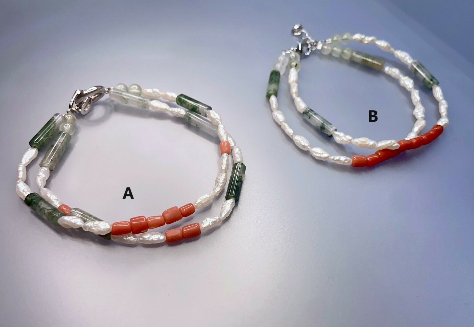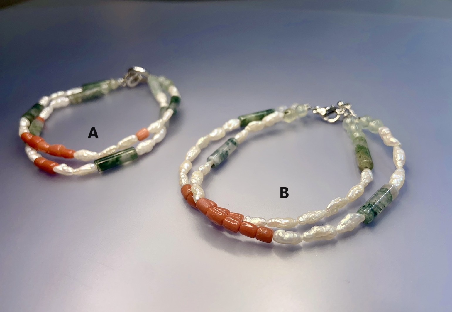 4. 搭配葡萄石、月光石等小珠結尾串接以調整長度